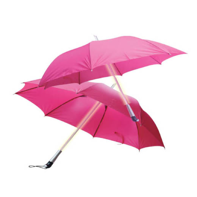 描述: 配有190T春亚纺布、14mm亚克力中棒、玻璃纤维伞架、3种变色LED灯胶手柄